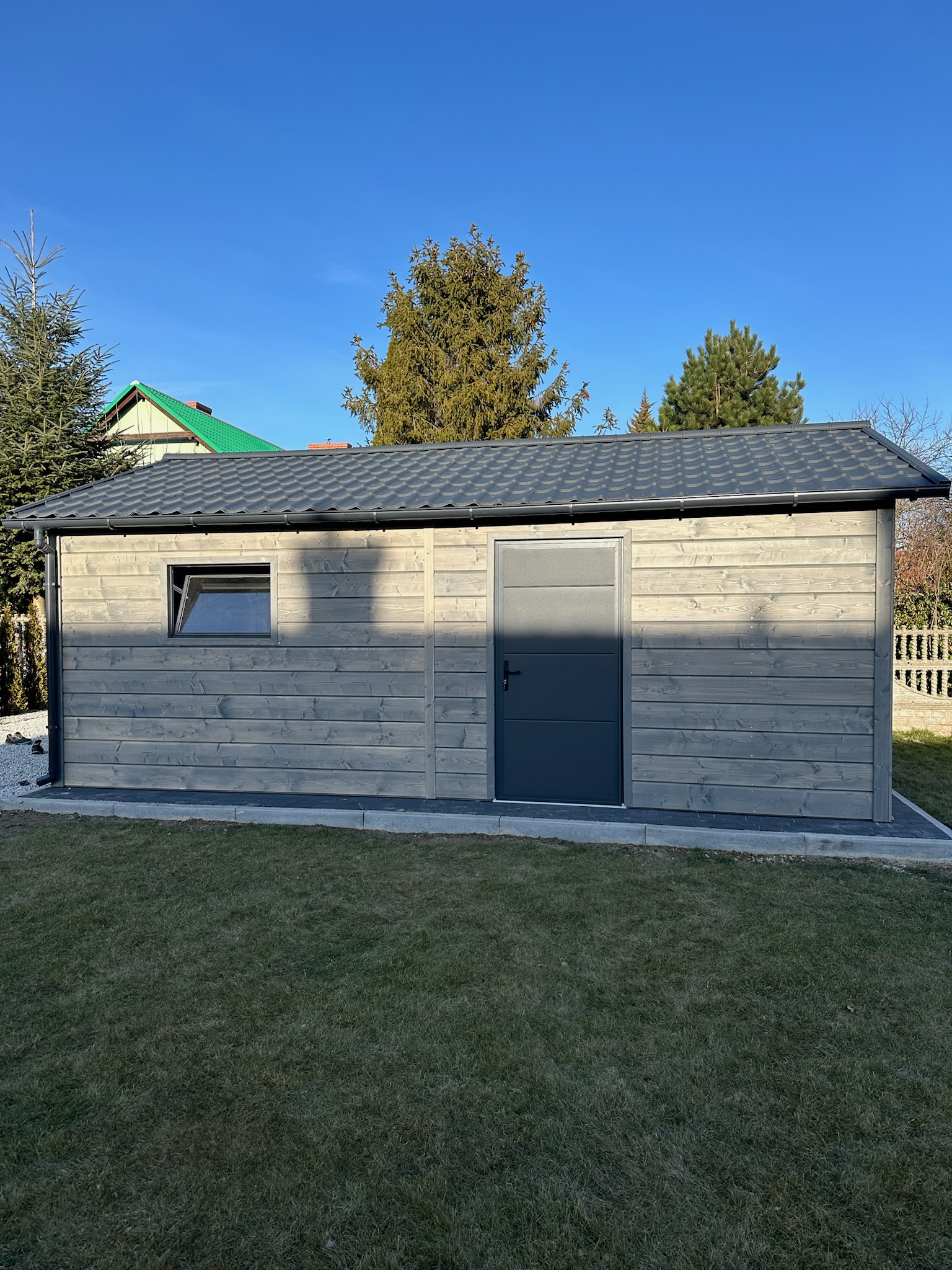 • Dach dwuspadowy, pokryty blachodachówką w kolorze RAL7016, z filcem antykondensacyjnym, pod spodem płyta OSB 15mm,